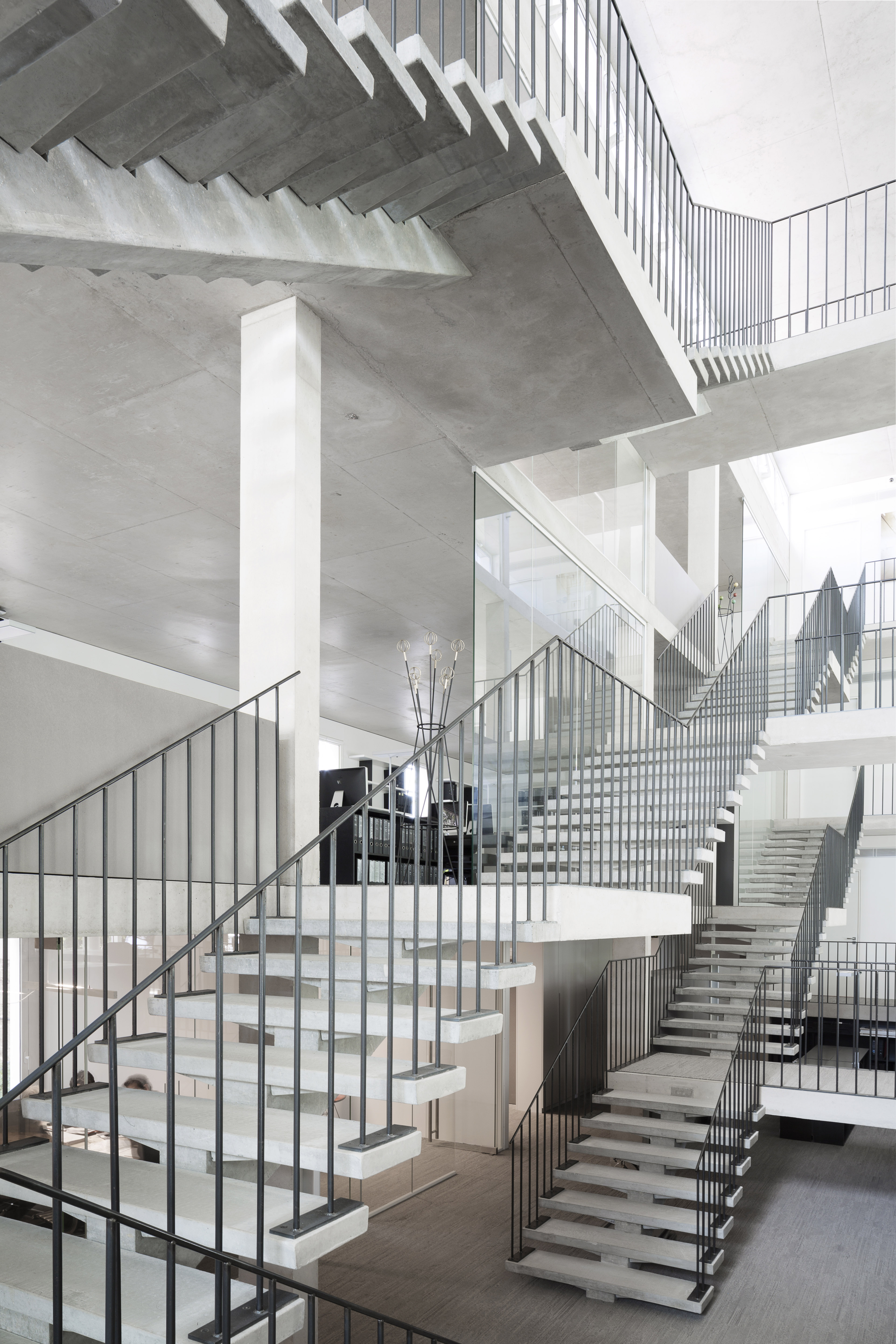 Les planchers de 20 cm d’épaisseur reposent directement sur des poteaux. L’ensemble des surfaces des plateaux a été traité à l’hélicoptère afin d’obtenir un état parfaitement lisse et homogène.